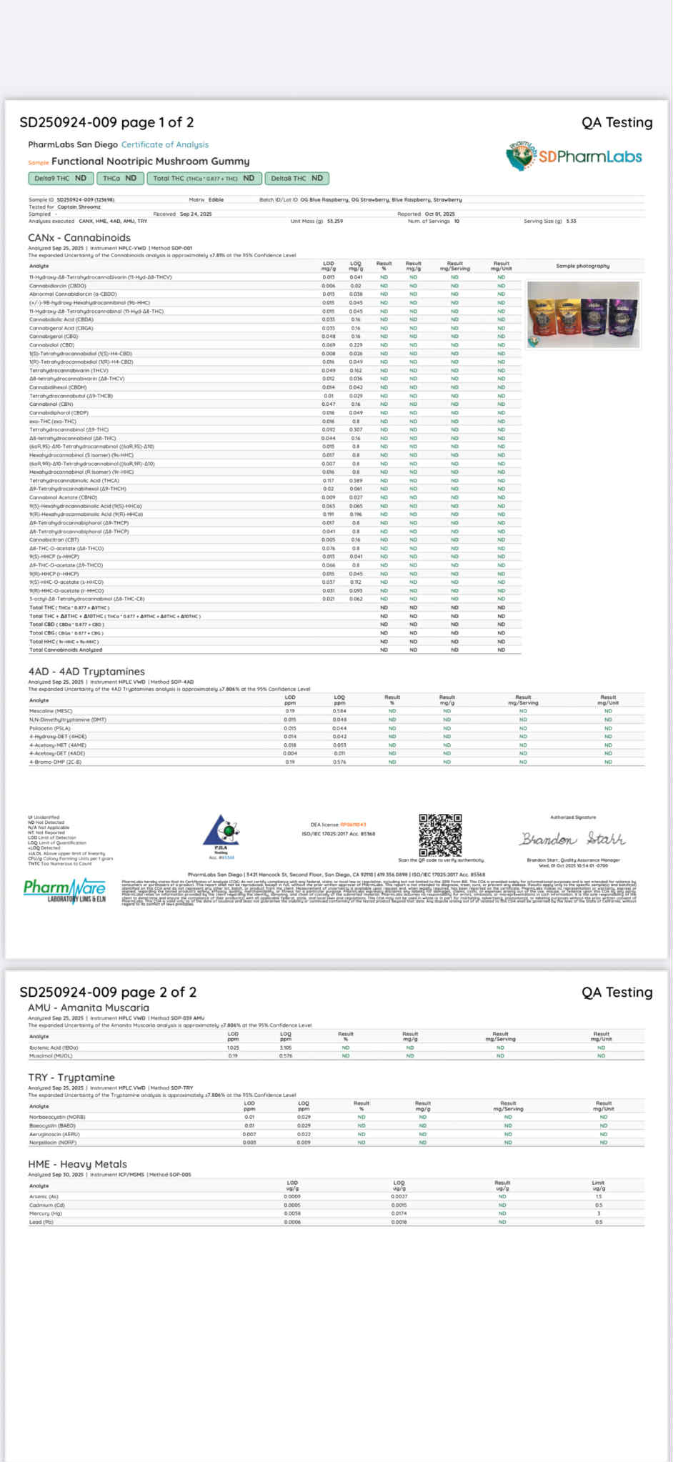 - 8g pack with eight evenly portioned 1g functional mushroom gummies