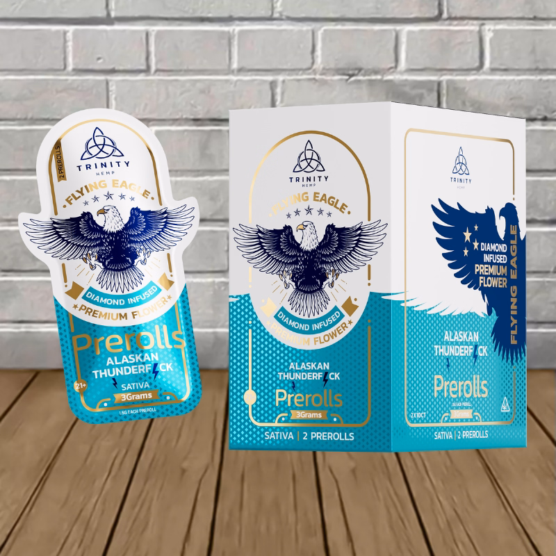 The Trinity Flying Eagle THCa prerolls 3g bring premium quality and powerful effects in every pack. Each set includes two 1.5g prerolls made with top-shelf hemp flower and infused with THCa diamonds for stronger potency and a smooth burn. Choose from strain options like Blue Dream, Kush Breath, and Alaskan Thunder to match your mood. Perfect for both seasoned smokers and curious newcomers, these prerolls deliver bold flavor, clean effects, and the convenience of a ready-to-use smoke.