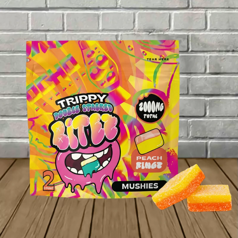 Trippy Double Stacked Bitez Mushies 2000mg pack serious potency into a compact 2ct bag, delivering bold flavor and strong euphoric effects. Each gummy is double-stacked for higher intensity, giving experienced users a longer-lasting and more controlled edible experience.