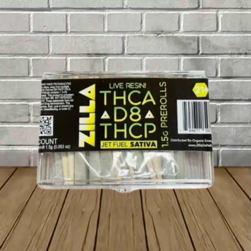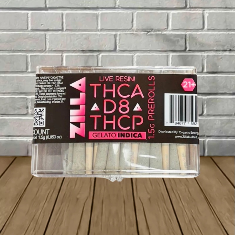 Zilla Live Resin THCa + Delta-8 + THCp Prerolls 50ct Party Pack; each preroll containing 1.5g of high potency, terpene-rich experience with live resin infusion. Each preroll blends THCa flower with D8 and THCp for a fuller, longer-lasting effect. The result feels smooth, flavorful, and consistent from start to finish. With strain options like Gelato, Ice Cream Cake, Jet Fuel, Pineapple Express, and OG Kush, it’s easy to find the right fit.